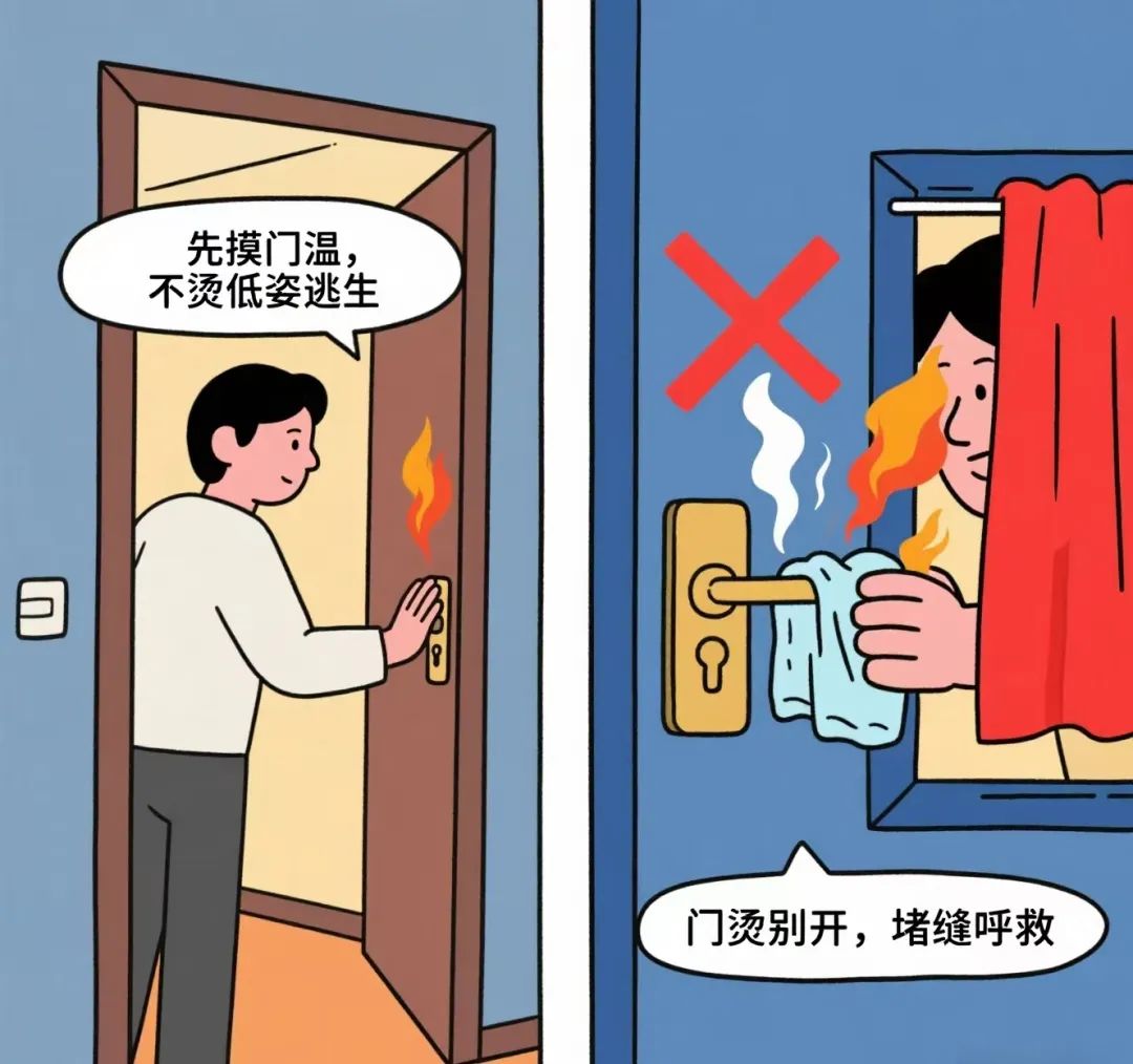 1.在家或酒店听到警报,先摸一下门的温度,不烫就开门低姿逃生;门烫就别开,用湿毛巾堵门缝,在窗口挂鲜艳衣物呼救。