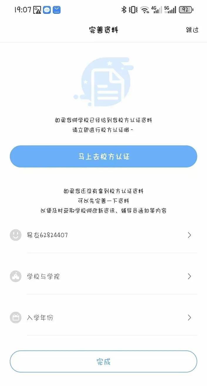 步骤三:在此界面填写基本信息,并点击“马上去校方认证”。