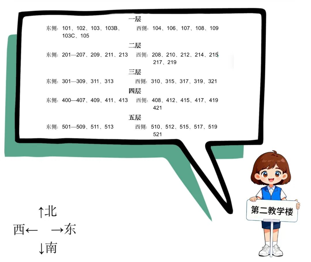 第二教学楼整体结构较规则,南门正对寝室楼,东侧毗邻第三教学楼,西侧毗邻篮球场。