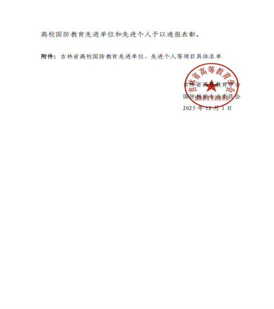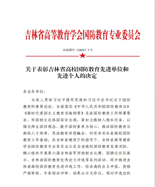 近日,由吉林省高等教育学会国防教育专业委员会主办的第六届吉林省高校国防教育系列活动圆满落幕。我校在此次活动中取得优异成绩,共荣获2项集体荣誉与3项个人荣誉,充分体现了我校长期以来高度重视并扎实推进国防教育工作的显著成效。
