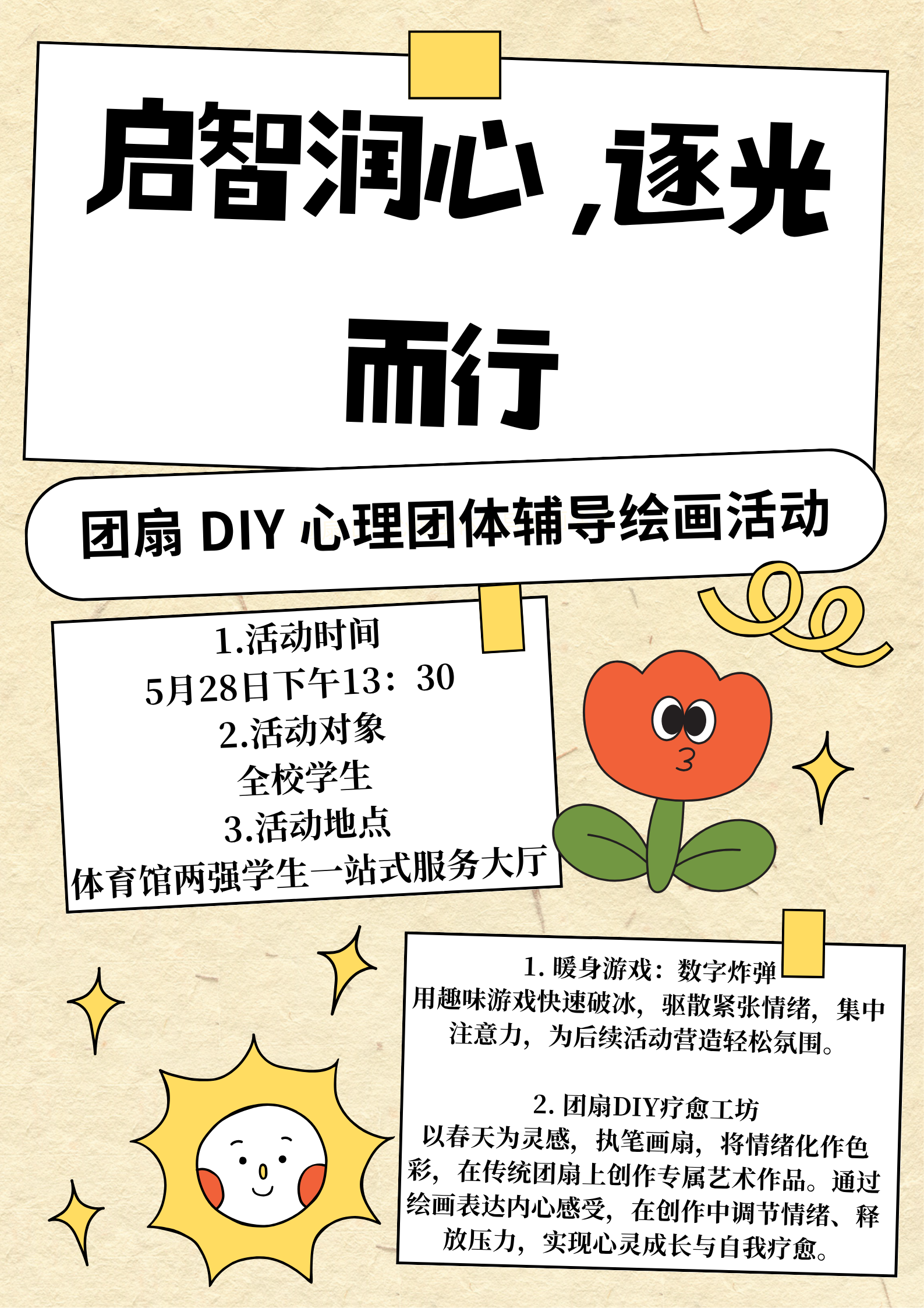 你是否渴望在忙碌的学习生活中寻得一方心灵的宁静天地?是否想通过独特的方式释放内心的情绪,探寻自我?按照《2025年心理健康教育专题月活动方案》要求,为助力大家以阳光心态、强健体魄开启青春筑梦新征程,心理健康教育与咨询中心精心策划了一场别开生面的团扇DIY心理团体辅导绘画活动,期待与你一同开启这场春日与心灵交织的浪漫之旅!